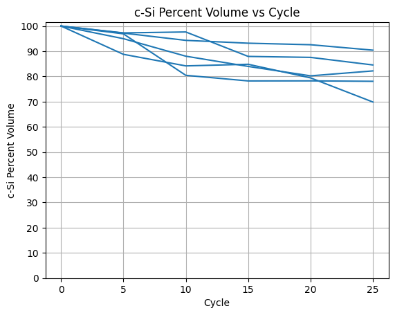 I began my analysis by finding the volume changes that occur during charge cycles. I repeatedly added and removed sodium ions from the silicon surface a total of 25 times in order to simulate 25 different charge cycles. In between each cycle I used the volume function to estimate and save the volume data. For the crystalline silicon, the volume dropped to just above 80% on average with the poorest performance going down to 70% and best up at 90%. For the amorphous silicon, the volume dropped to between 30-40% each time, signifying complete deformation (Figure 2). Atomistic snapshots revealed that crystalline silicon maintained a degree of lattice order and occasionally exhibited local rearrangement that partially restored its structure after sodium removal (Figure 3). On the other hand, amorphous silicon showed no signs of restoration, resulting in much more rapid degradation. Additionally, during the Molecular Dynamics simulations, sodium ions remained primarily adsorbed on the surface of the silicon structures, with minimal penetration beyond the surface layer.
