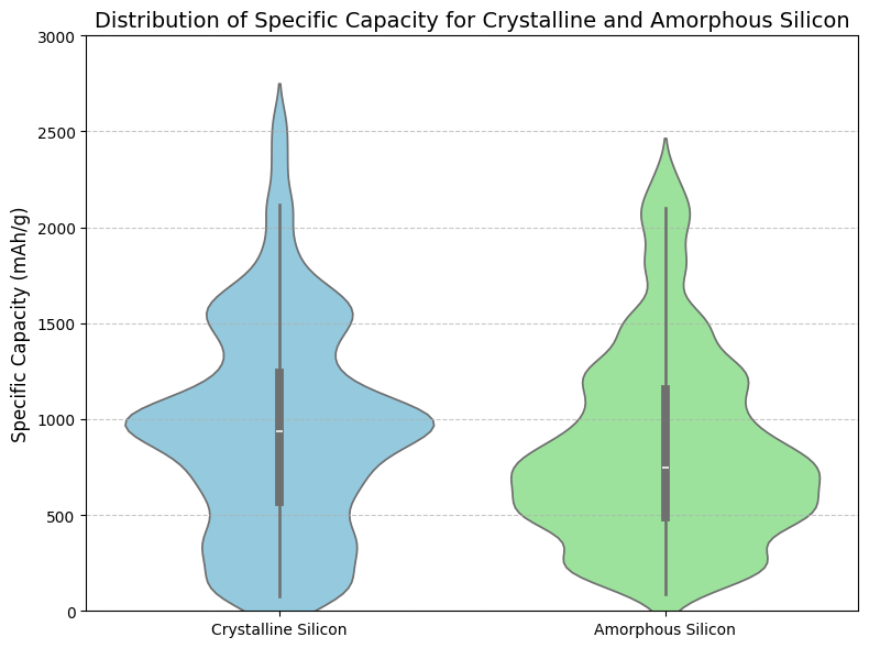 The specific capacity of the silicon structures was also calculated using a Molecular Dynamics simulation. Sodium ions were added in groups of 18 until structural instability occurred. A sodium ion was considered held if it was within 2.5 Å of any silicon atom. For each material, 100 simulations trials were performed to capture variability. Crystalline silicon exhibited an average specific capacity of 944.29 ± 541.04 mAh/g, while amorphous silicon showed 847.82 ± 499.48 mAh/g (Figure 4).