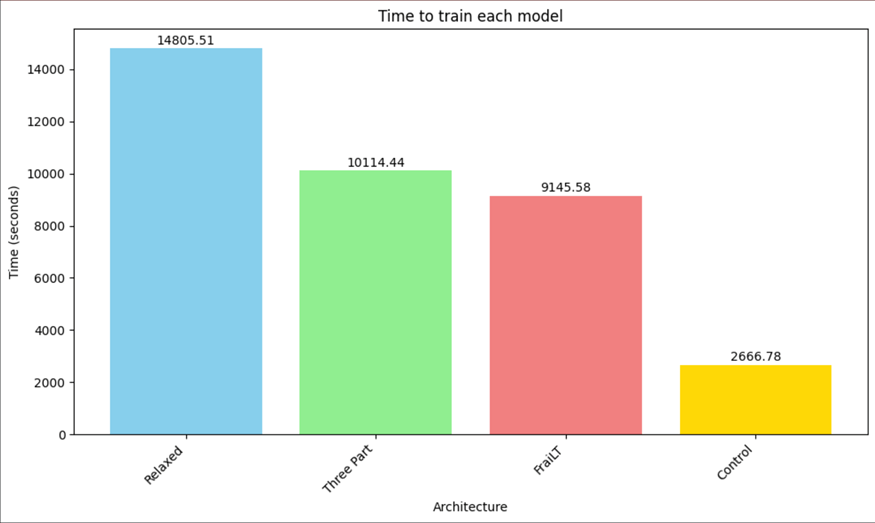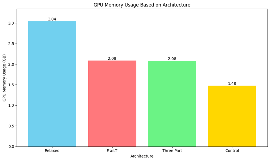 Training duration was increased for all recurrent models, as evident in Figure 1. FraiLT and Three Part’s duration were almost quadruple the control’, while memory usage increased by one third, as shown in Figure 2. This demonstrates that recurrent models require four times the compute, but not four times the memory. The Relaxed architecture exhibited a large increase in memory usage and training duration from the other recurrent depth models (see Figure 1 and Figure 2). This could potentially be attributed to the increase in parameters, or poor implementation of LoRAs. A basic estimate of the increase in VRAM, calculated using (5,462,272/4,344,320) * 2.08, would result in ~2.6GB of usage. This is a significant difference from the actual VRAM usage of 3.04 hinting at a poor LoRA implementation.