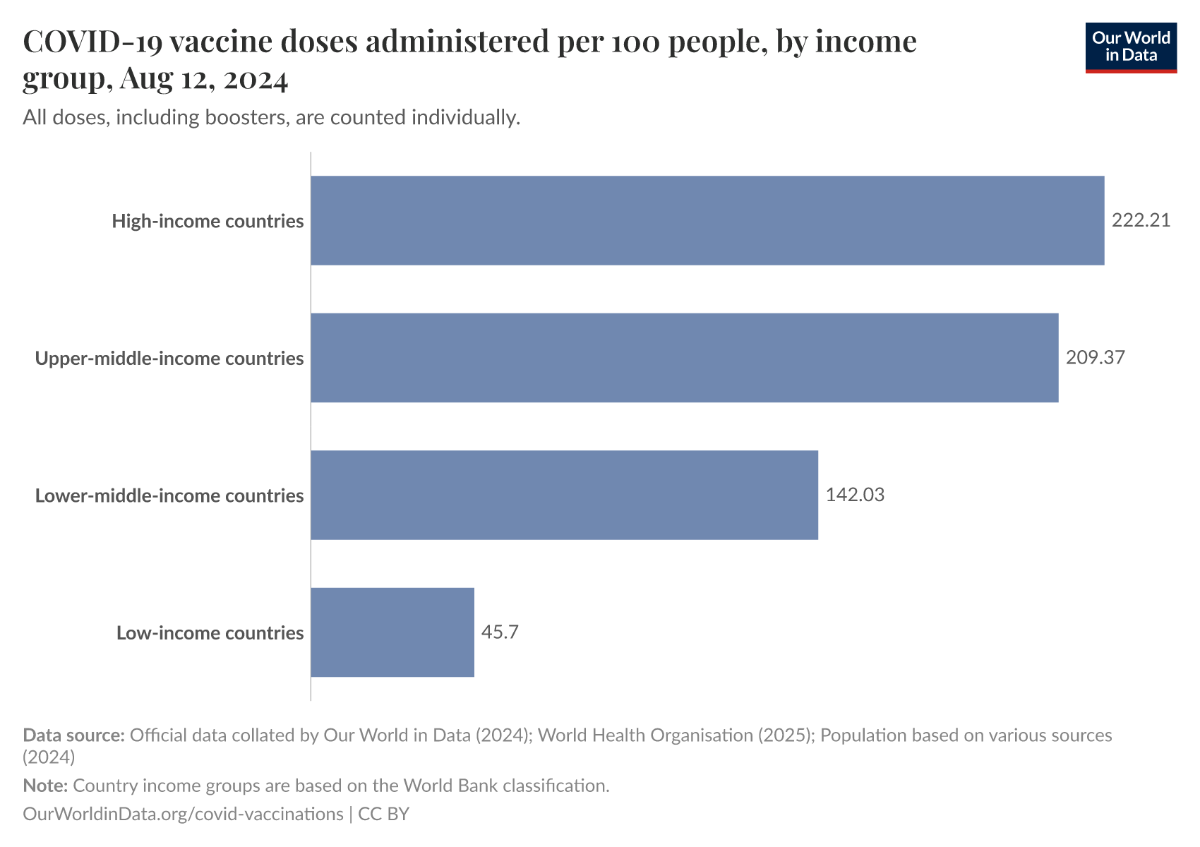 This graph shows the COVID-19 vaccine doses administered per 100 people categorized by the country’s income group. As pictured, the countries with the highest income had 233,77 doses administered per 100 people as of August 12, 2024, while the countries with the lowest income only had 45.7 doses administered per 100 people as of August 12, 2024. This shows the correlation between the country’s income group and how many people within that country are successful in becoming vaccinated. The largest amount of vaccinated people belongs to the high-income countries while the smallest amount of vaccinated people belongs to the low-incomes countries. The disparity found in this graph demonstrates the need to make vaccines accessible for everyone.