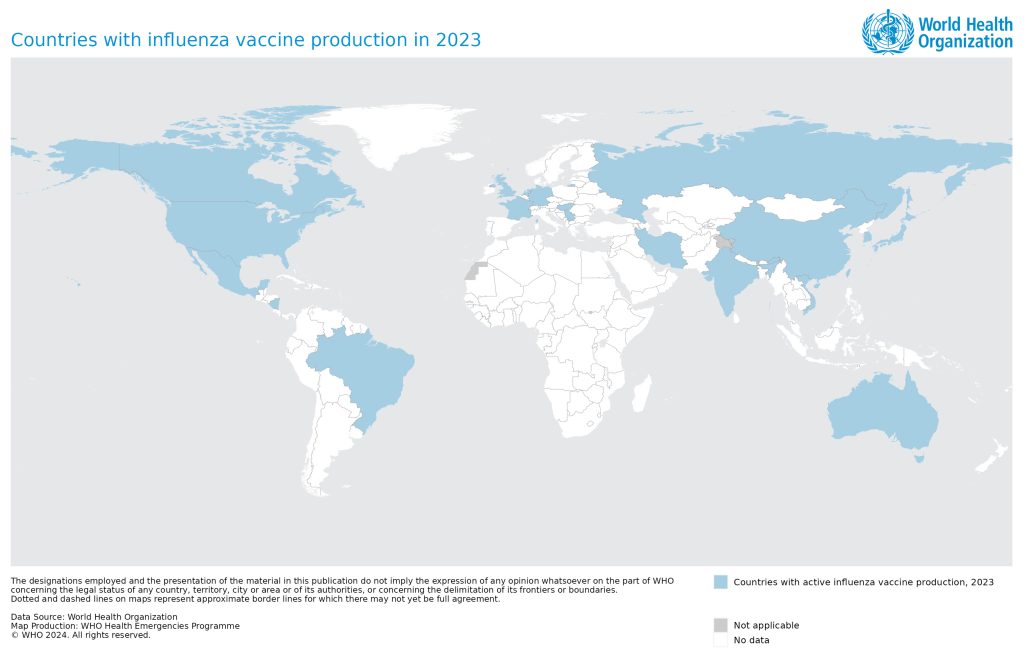 This graph displays the countries that have full influenza vaccine production in 2023: United States, Mexico, Brazil, Argentina, United Kingdom, France, Germany, Italy, Netherlands, Belgium Hungary, Russia, China, India, Japan, South Korea, Thailand, Vietnam, Kazakhstan, Indonesia and Australia. Only 22 out of 195 countries have full influenza vaccine production capabilities as of 2023, which shows that vaccine production still has a room to develop. Almost half of these countries were present in the 50 richest countries in the world based on GDP per capita in 2023, according to Worlddata.info. Low-income countries also took months longer than middle and high-income countries to distribute enough vaccines to cover their 65+ population22. This contributes to the fact that wealthier countries generally have more vaccination capabilities. The net cost of vaccination includes capital, staff, and vaccine substance, which some countries may not be able to afford9. Because of the disparity, there should be an improved way for higher income countries to work with lower income countries.