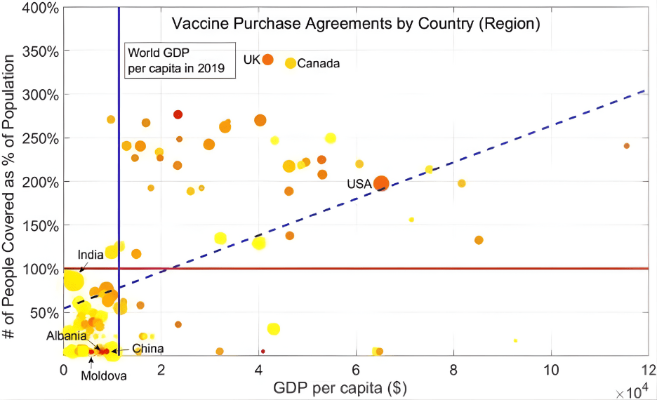 This graph displays wealthier countries (based on GDP per capita) like the United States and Canada purchasing excessive vaccines for their population sizes. The hoarding of vaccines by countries like these takes a toll on other poorer countries like Albania because it leaves them with vaccinate more than three times its population, while Albania could only buy enough to vaccinate about 5% of its population24.