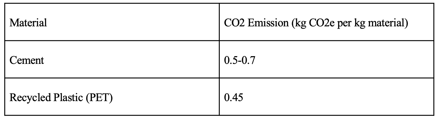 reductions exceeding 50% compared to cement production22‘23. However, these figures are specific to the cited projects and may not be representative of all recycled plastic construction applications.