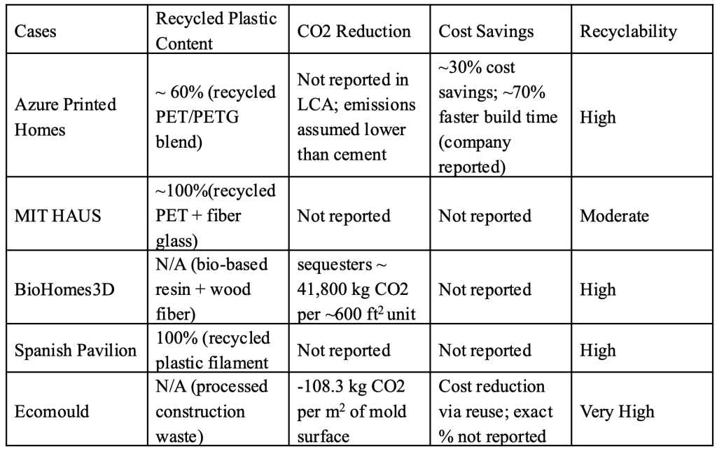 Azure Printed Homes demonstrates large-scale housing potential, while MIT HAUS explores academic and technological innovation. BioHome3D showcases sustainable material integration, and the Pavilion emphasizes design and structural versatility. Lastly, the use of recycled construction waste for mold making illustrates how 3D-printing can innovate building processes. Together, these cases provide a comprehensive view of the opportunities and limitations of this approach. These cases show various approaches in material use, design scale, environmental performance, and feasibility. Through this relative framework, this looks at the applicability of recycled plastics in additive manufacturing across different scales and environmental settings. All units are metric (e.g., kg, (