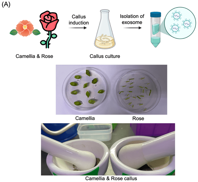 Exosomes were derived from Camellia japonica and Rosa spp. calluses. Callus tissues were induced using Murashige and Skoog (MS) medium supplemented with 2,4-dichlorophenoxyacetic acid (2,4-D) and kinetin. After 4 weeks of cultivation, conditioned media were collected and subjected to sequential centrifugation steps (300 × g for 10 min to remove cells, 2,000 × g for 20 min to eliminate debris, and 10,000 × g for 30 min to remove large vesicles). The supernatant was then ultracentrifuged at 100,000 × g for 90 min. Pellets were washed in PBS and re-pelleted at 100,000 × g to reduce protein contamination. To further enrich small extracellular vesicles, a commercial precipitation reagent (ExoQuick, System Biosciences, USA) was applied following the manufacturer’s protocol.