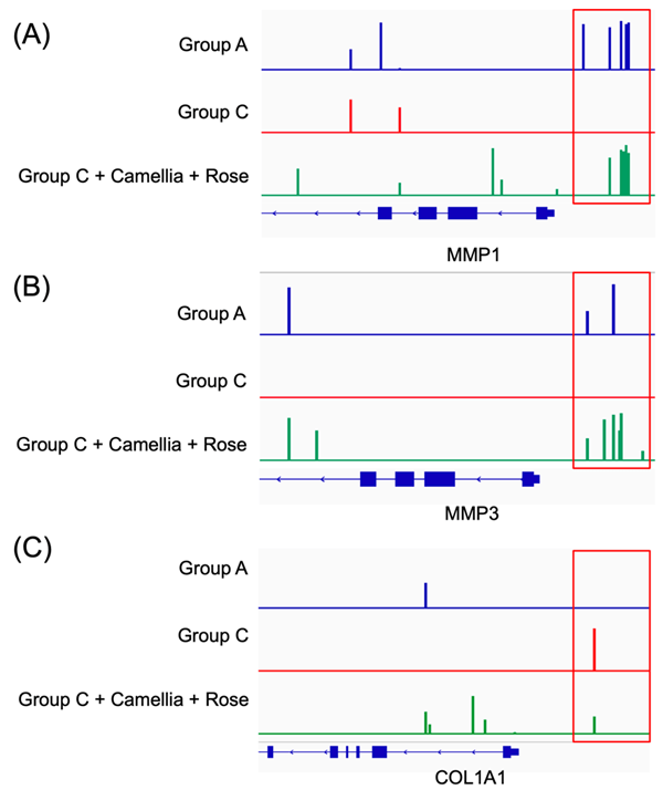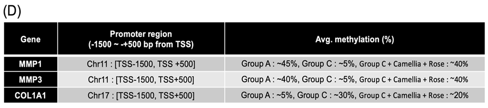 After applying a combination of Camellia japonica and Rosa spp. callus-derived exosomes, EM-seq was used to analyze the methylation patterns of the promoters of MMP1, MMP3, and COL1A1. The results showed that the promoters of MMP1 and MMP3 shifted to hypermethylation (Figs. 5A and B), resembling the Group A condition. This suggests the recovery of gene silencing. In contrast, the COL1A1 promoter shifted to hypomethylation (Fig. 5C), indicating an epigenetic change that promotes collagen synthesis. This suggests that the combination of exosome treatments acted to activate COL1A1, a key gene in collagen synthesis, thereby potentially contributing to skin regeneration and aging recovery. Furthermore, the combined exosome treatment balanced the expression of MMP1, MMP3, and COL1A1, showing the potential for reversible dual solutions for skin aging regulation.