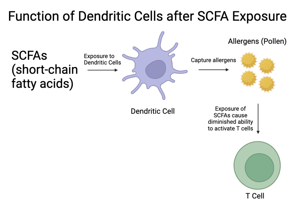 Short-chain fatty acids (SCFAs) from the gut can modulate dendritic cells and Th2 activation, reducing cytokine production and subsequent airway inflammation (Figure 3 & Figure 4)34.
