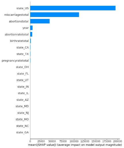 The SHAP5 plot highlights the significant influence of factors like state US, miscarriage total, and abortion total on a machine learning model’s predictions. These variables can be tied to broader public health concerns, access to healthcare, and policy differences across states. For instance, the importance of abortion total and abortion rate total may reflect the ongoing impact of restrictive abortion14 laws and disparities in access to reproductive healthcare. Following the overturning of Roe v. Wade3, many states implemented strict abortion laws, creating significant disparities in access to abortion services. This ties directly to current debates surrounding reproductive rights, federal vs. state policies, and the challenges many individuals face in obtaining care.