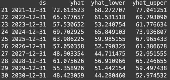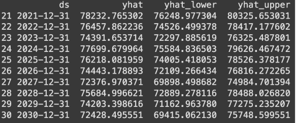 The table summarizes Prophet’s predictions, showing declining births with short-term rebounds around 2028–2029, reflecting possible sensitivity to economic and policy shifts.