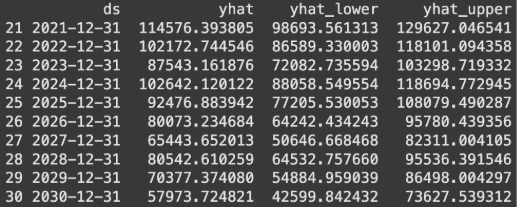Tabular summary of Prophet’s predictions. While total births decline overall, short-term rebounds are visible around 2027–2028, suggesting sensitivity to external shocks such as policy shifts or economic changes.