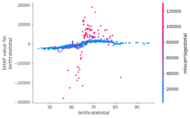 This graph plots the SHAP5 values for the feature abortion rate total against the abortion14 rate. The color gradient reflects the total number of miscarriages15 (miscarriagetotal). The negative correlation between SHAP values and abortion rate suggests that higher abortion rates may reduce the feature’s importance in the model’s predictions. However, clusters of red points (high miscarriage totals) around moderate abortion rates highlight a potential overlap of factors influencing both abortions and miscarriages, such as healthcare access or societal norms regarding family planning.