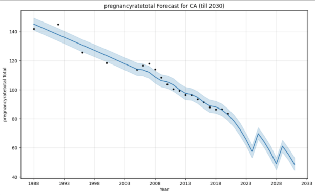Forecasts mirror the decline in births, with intermittent rebounds late in the decade. California’s trajectory reflects broader improvements in contraception, lower pregnancy rates, and demographic shifts such as delayed childbearing. Texas shows more volatility, where restrictive reproductive policies and disparities in healthcare access amplify fluctuations. These differences underscore how state-level policy environments directly shape reproductive outcomes.