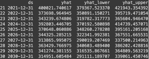 - d) Prophet decomposed the series into trend and seasonal components, producing forward projections with confidence intervals.