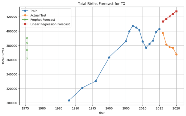 To validate the accuracy of the Prophet6 model in Texas, forecasts were again compared against a linear regression baseline using RMSE8 and MAPE9. Prophet achieved an RMSE of 8,625.96 and a MAPE of 1.84%, whereas linear regression performed considerably worse, with an RMSE of 42,771.15 and a MAPE of 10.68%. These results show that Prophet was able to closely reproduce the observed fertility patterns in Texas, with average prediction errors under 2% of the actual values. In contrast, the linear regression model significantly misrepresented the data, reflecting its limitations in capturing nonlinear fertility dynamics.