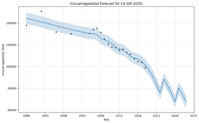 Tabular summary of predicted miscarriage totals. Projections indicate continued declines, but late-decade rebounds may reflect changing maternal health conditions or improved reporting.