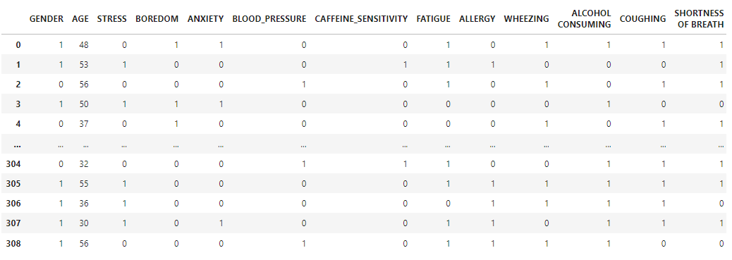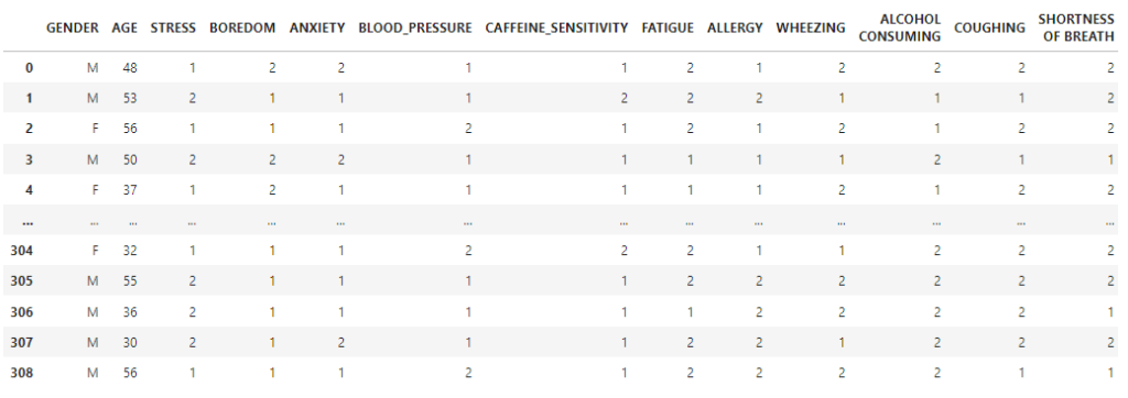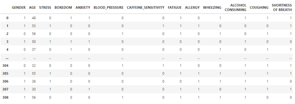 In selecting features for analysis, this study focuses on factors that are commonly associated with the onset of tics in individuals with autism, such as stress, boredom, and anxiety. These variables were chosen based on prior research linking emotional or environmental factors to increased tic activity amongst individuals15‘16‘17. By incorporating these factors, the model aimed to capture the most realistic behavioral patterns it could. A synthetic data set was created to resemble real-world data and included many of the correlated factors. Some of the factors are known to be not causally related to tic onsets. Using Python coding and built-in libraries, the data were first organized and refined to ensure accuracy and relevance. In its initial stage, irrelevant features from the data were filtered out under a supervised mode to focus on the factors that were potentially influencing tic occurrences, following standard preprocessing methods in machine learning research9‘11. Variables such as height, zip code, parental status, employment, and college education were excluded because they were not expected to have a meaningful relationship with tic frequency or intensity. This filtering process improved efficiency and data integrity by preventing unrelated variables from influencing results. Duplicate entries were also weeded out to produce the highest-quality data set suitable for analysis. The remaining relevant data were transformed into a binary format using Python’s data transformation methods. Each variable was ended as either 0 or 1, representing the presence or absence of an influence on tic occurrence. This structure made for an easier comparison and compatibility with machine learning algorithms, particularly those that relied on classification models11‘12. Continuous variables such as age were maintained in their numerical form. As noted in the labels below, Figure 1 illustrates the data before transformation, with values being either 1 or 2. Figure 2 shows the transformed data, with values of either zero or one, which provides a simpler way of comparing the feature values with each other. After preprocessing, the data were divided into numerous steps to enable accurate model evaluations. Logistic Regression, Decision Tree, and K-Nearest Neighbor were implemented to identify parents and predict the likelihood of tic occurrence. Lastly, hyperparameter tuning was applied to optimize each model’s performance, allowing the most accurate prediction of when tics would occur9‘18.