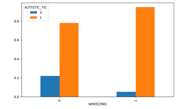 The best way to present the correlation between factors affecting mood or health, and whether or not they had tics, was through comparative charts that demonstrated correlations. Visual graphs and correlation maps have been widely used for machine learning studies for a better interpretation of model behavior18‘10. For example, Figure 3 below shows the correlation between tics and wheezing. As shown by the legend at the top left, blue (0, no) shows no autistic tics, and orange (1, yes) shows having tics. This graph represents two separate groups, wheezing and having autistic tics, and will demonstrate if there is a correlation between the two factors. The two bars on the right represent the people who wheeze compared. The graph shows how a larger percentage of autistic people who wheeze also have tics, confirming some correlation between the two factors.