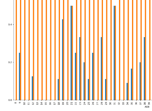 For data that could not be categorized into yes (1) and no (0), such as age, a new method was created with different parameters to properly display the data according to value. The correlation graph for age and tics, Figure 4, is shown above, with age on the x-axis and correlation on the y-axis, with blue (0, no) showing no autistic tics, and orange (1, yes) showing having tics. This is an example of a feature that shows no apparent correlation, as all age groups from 8 to 70 had certain individuals with tics and some without. Based on this information, age does not correlate with tics. This outcome is consistent with autism prediction research, which shows that behavioral and contextual features are more informative than demographic variables when modeling outcomes19‘12.
