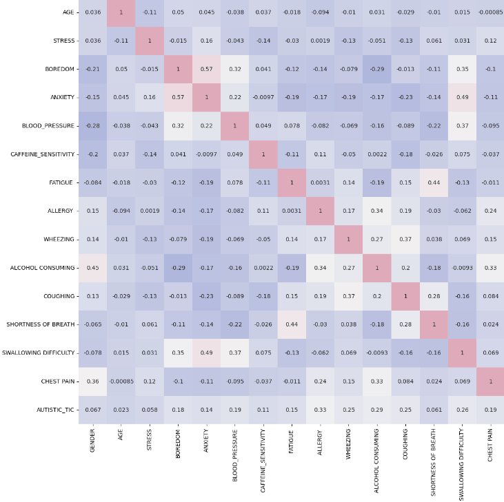 After modifying parameters such as the dimensions for the graph, sample size of the data being used, and the number of iterations the code goes through, the same process was used for the analysis of all the factors in the data set using the same code. Since the individual graphs were complete, a correlation map was made to provide an overview of the results collected thus far. The graph uses colors and a color scale, with blue representing a low correlation and pink representing a high correlation, to represent which correlation was the strongest. Figure 5 below shows the full correlation chart and displays how the highest correlation values are between boredom and anxiety, as shown by the pink squares at the intersections of these factors. This information made it clear what the most prominent and highly correlated factors are and how they can be used to analyze when tics are about to happen. Clinical research similarly shows how emotional and stressful situations tend to enhance tic behavior20.