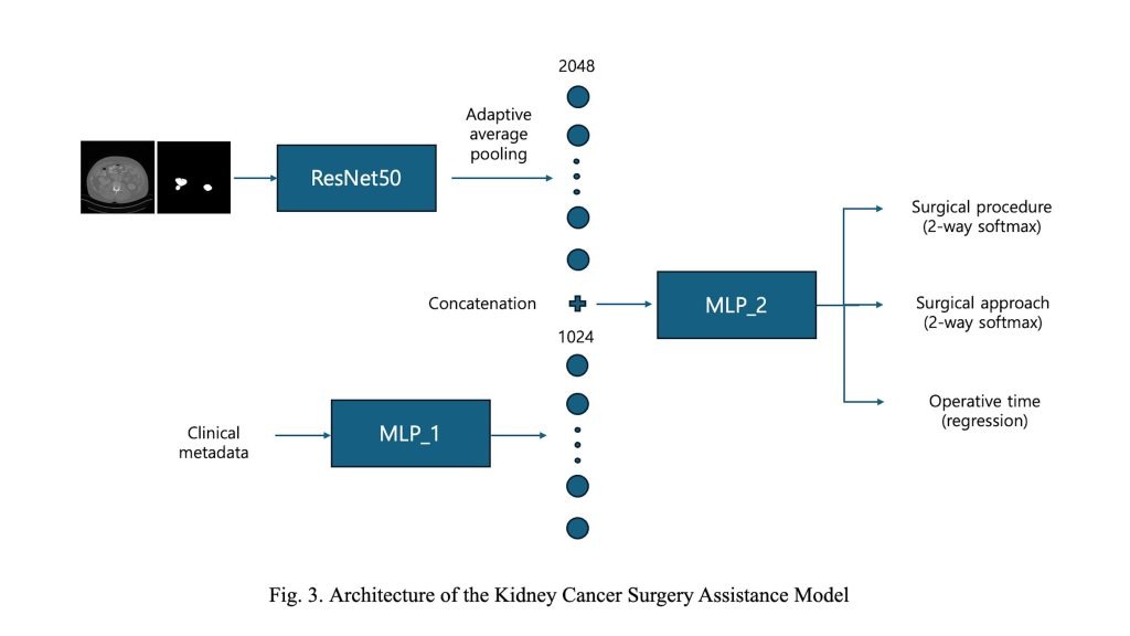To overcome these limitations, deep learning, particularly convolutional neural networks (CNNs)—has transformed medical image segmentation. Architectures such as U-Net and its variants have achieved remarkable accuracy in delineating kidneys and renal tumors by learning hierarchical representations from annotated CT datasets4‘5. These models outperform conventional algorithms in both speed and consistency. However, segmentation alone does not address the full spectrum of clinical needs. Surgical planning for kidney cancer requires integrating imaging data with relevant clinical information, including patient demographics and tumor characteristics, to inform the choice of surgical method and anticipate operative complexity.