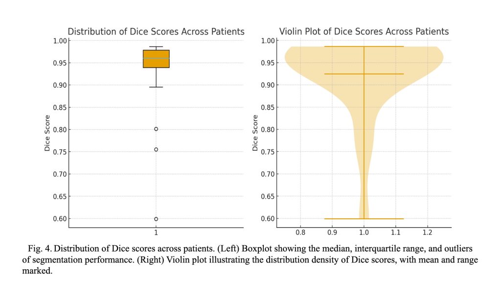 ). As illustrated in Figure 4, the boxplot and violin plot provide a clear depiction of the distribution of Dice scores across patients, highlighting both the overall consistency and variability of the segmentation performance. As shown in Figure 5, visual inspection of the segmentation results reveals that while minor discrepancies are observed within the internal regions of the tumor, the model accurately captures the overall tumor boundaries. This suggests that the segmentation model effectively learns the global structure of the tumor, even if slight variations exist in pixel-level predictions.
