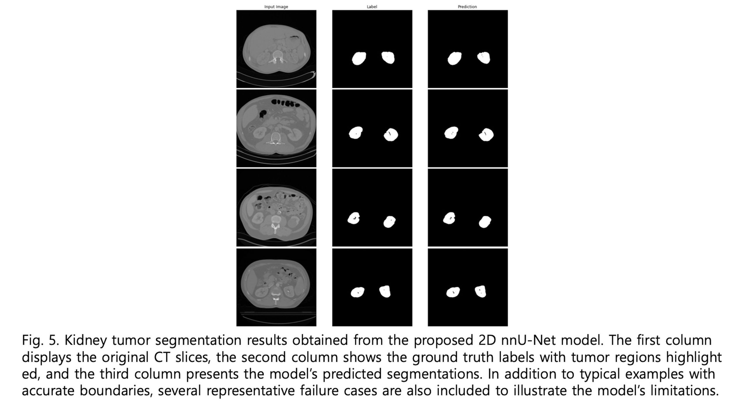 I developed a segmentation model based on the 2D nnU-Net architecture. While the 3D nnU-Net generally offers superior performance, it also has significant drawbacks, including higher GPU memory consumption and longer inference time. In my study, however, I was unable to utilize the 3D nnU-Net due to the inconsistency in the z-axis resolution and the anatomical coverage of CT scans across patients. If only one of these factors had varied—for instance, if only the z-axis resolution differed—interpolation could have addressed the issue. Alternatively, if only the scanned anatomical range varied, I could have manually cropped the kidney region. However, due to the simultaneous variation in both aspects, applying a 3D model was not feasible. Moreover, the large disparity in z-axis resolution was expected to significantly degrade the performance of a 3D model, justifying my use of the 2D nnU-Net.