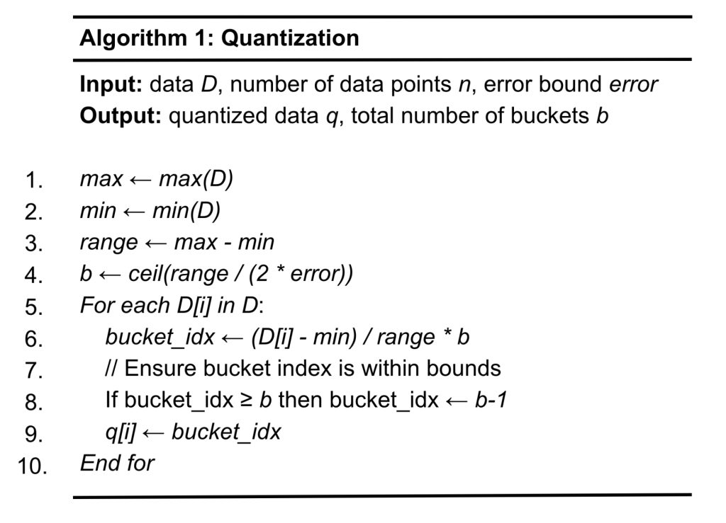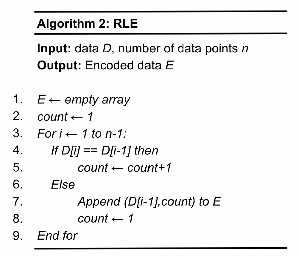 Once the data is quantized, it can then be compressed by RLE, as shown in Algorithm 2. RLE takes the quantized data D and produces the encoded data E. Line 1 allocates the memory space for the encoded data. Lines 3 to 9 go through the entire dataset, and if the two adjacent data points, D[i] and D[i-1], have the same value (Line 4), a counter (count), which records the times a data value appears in a consecutive manner, will be incremented by one (Line 5). This process will be repeated until a different value is encountered (Line 6), and the resulting run-length pair will be appended to the encoded data (Line 7) with the counter (count) reset to 1 to identify the next run (Line 8). Algorithm 3 shows the run-length decoding. In particular, Lines 4 to 6 convert a run-length pair to the original data by repeating a symbol for count times. The time complexity of RLE is O(n).