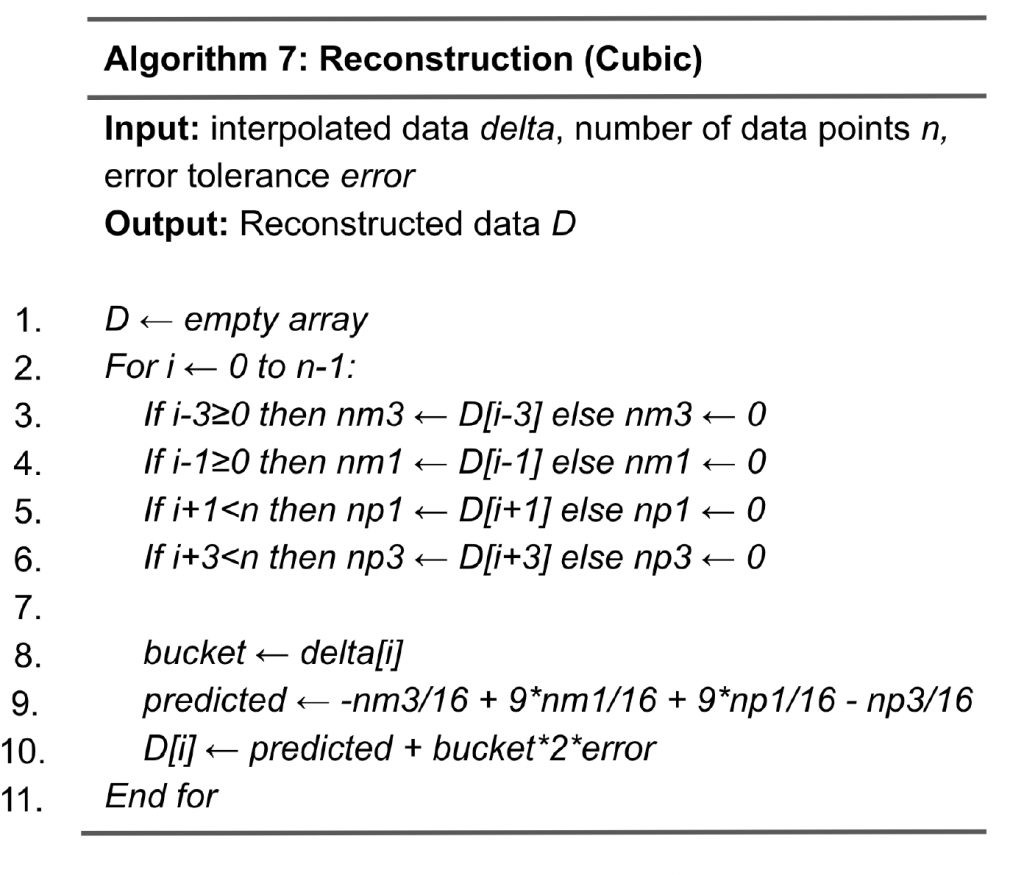 Algorithm 6 shows the steps of cubic interpolation. As compared to linear interpolation, which involves two adjacent data points, cubic interpolation uses four neighboring data points for a better quality of prediction. In particular, for data point D[i], it utilizes the values of D[i-3], D[i-1], D[i+1], and D[i+3], captured by variables nm3, nm1, np1, np3, respectively. The predicted value of D[i] is calculated in Line 9 as -nm3/16+9*nm1/16+9*np1/16-np3/16, and the delta d is calculated in line 11. Next, in lines 12 to 13, the delta is mapped to a bucket. Overall, the quantization is designed as follows: the range of bucket 0 is [-error, error] and the range of bucket 1 is [error, 3*error], and so on. Therefore, given delta d, the bucket assigned is sign*(fabs(d)+error)/(2*error), where fabs(d) is the absolute value of d and variable sign is the sign of d. Algorithm 7 shows the steps of reconstruction for cubic interpolation. As compared to the reconstruction for linear interpolation (Algorithm 5), the main difference is the calculation of the predicted value in line 9, which involves nm3, nm1, np1, and np3.