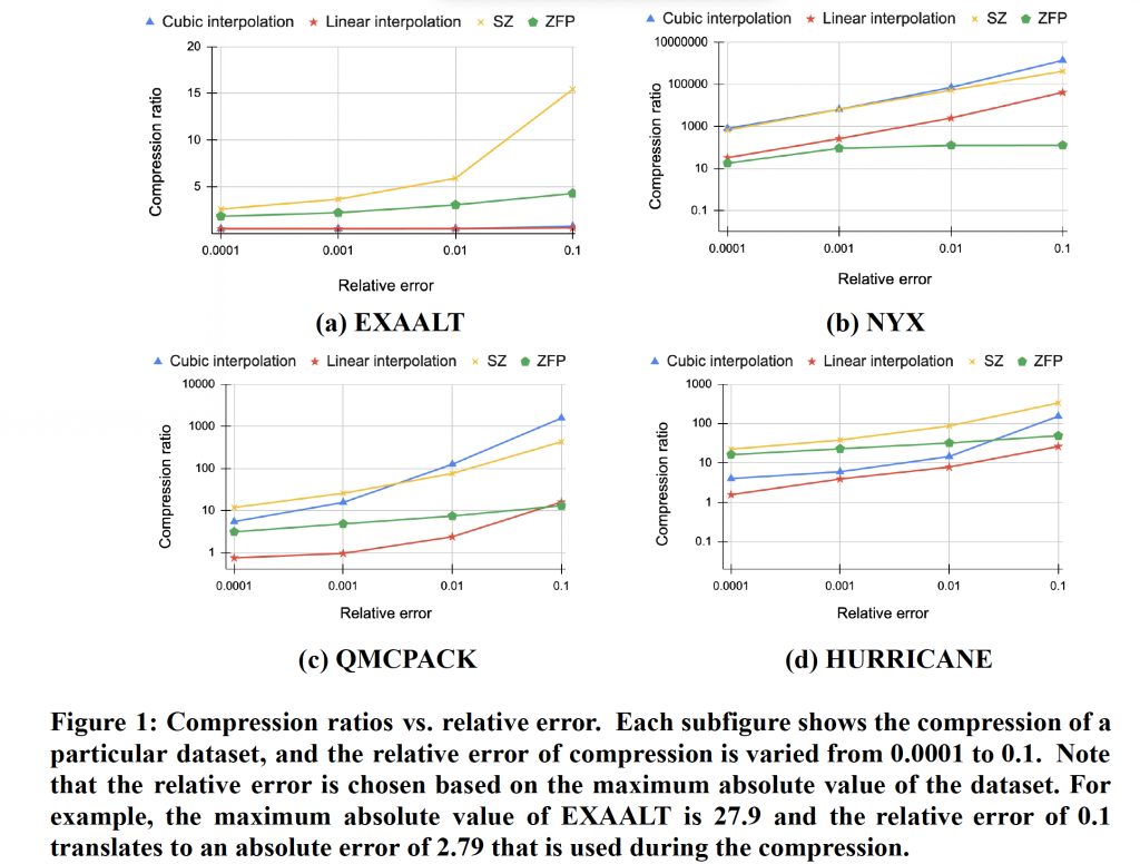 This work uses the absolute error for error control. The error can be calculated by multiplying the relative error (e.g, 10%) by the maximum absolute value of the data. This error metric is commonly known as relative L-infinity error in the literature. Figure 1 shows the relationship between compression ratio and relative error across four datasets, EXAALT, NYX, QMCPACK, and HURRICANE, respectively. The performances of linear and cubic interpolations are compared with state-of-the-art compressors SZ and ZFP. It is observed that the general trend is that as the relative error is loosened from 0.0001 to 0.1, the compression ratio improves substantially. This is because, as the relative error increases, the interval of a quantization bucket becomes larger, and therefore more data points can be grouped into a bucket during quantization, thus resulting in more repeated buckets and, in turn, higher compressibility of data. More importantly, it is shown in Figure 1 that the cubic interpolation outperforms the linear interpolation significantly across all datasets. For example, the QMCPACK dataset undergoing cubic interpolation has an average compression ratio of 425.2, which is two orders of magnitude higher than that of the linear interpolation, which has an average compression ratio of 5.0. The reason for higher compression ratios for cubic interpolation is that it can better predict the data values, and therefore, it is more likely to achieve repeated values after quantization. Under tight error bounds (<0.1), the EXAALT dataset’s linear interpolation achieves similar compression ratios as cubic. The reason is that the EXAALT data varies significantly and is hard to compress. As a result, the cubic interpolation still suffers from inaccurate prediction. On the other hand, it is observed that the cubic can outperform SZ and ZFP for NYX and QMCPACK, demonstrating its performance advantage in certain scenarios as compared to the best compressors in the literature.