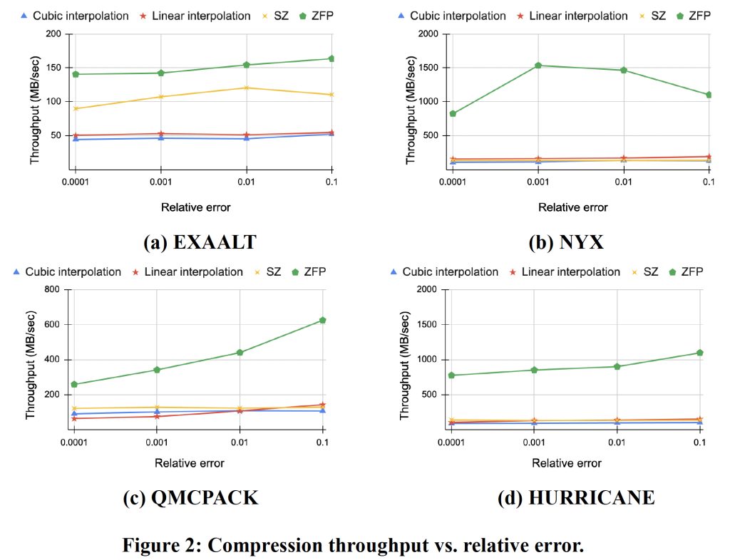 Figure 2 measures the throughput across various error bounds. The timing of compression was obtained by adding a pair of C/C++ clock() functions, which return the number of clock ticks elapsed since the test was launched. The clock() functions are inserted before and after the compression routine is invoked, respectively. The throughput is then calculated by dividing the size of the input data by the compression time. In general, cubic interpolation requires more time to compress data due to the use of more data points for interpolation (discussed in Algorithm 6) and therefore, its throughput is expected to be lower than that of linear interpolation. An exception to this trend is the throughput for QMCPACK where under tight error bounds, the linear interpolation results in a lower throughput. This can be explained as follows. The compression algorithms developed in this work mainly consist of two steps: interpolation and lossless encoding. Since linear involves fewer neighboring data points, its overhead is lower than that of cubic. However, the lossless encoding for linear interpolation is observed to have higher overhead than cubic because of the data characteristics of QMCPACK. For example, we collected the timings of compression for both linear and cubic interpolations for QMCPACK at an error of 0.0001. For cubic interpolation, the interpolation operation takes 5.7 secs and RLE takes 0.98 secs. For linear interpolation, the interpolation operation takes a shorter time of 3.67 secs, as expected, but RLE takes 5.37 secs, which is much longer than cubic. This caused the slower throughput of linear interpolation-based compression. Furthermore, it is observed that ZFP offers the highest compression throughput, while for certain scenarios, the linear interpolation can outperform SZ. Cubic, due to its high complexity, has the lowest throughput.
