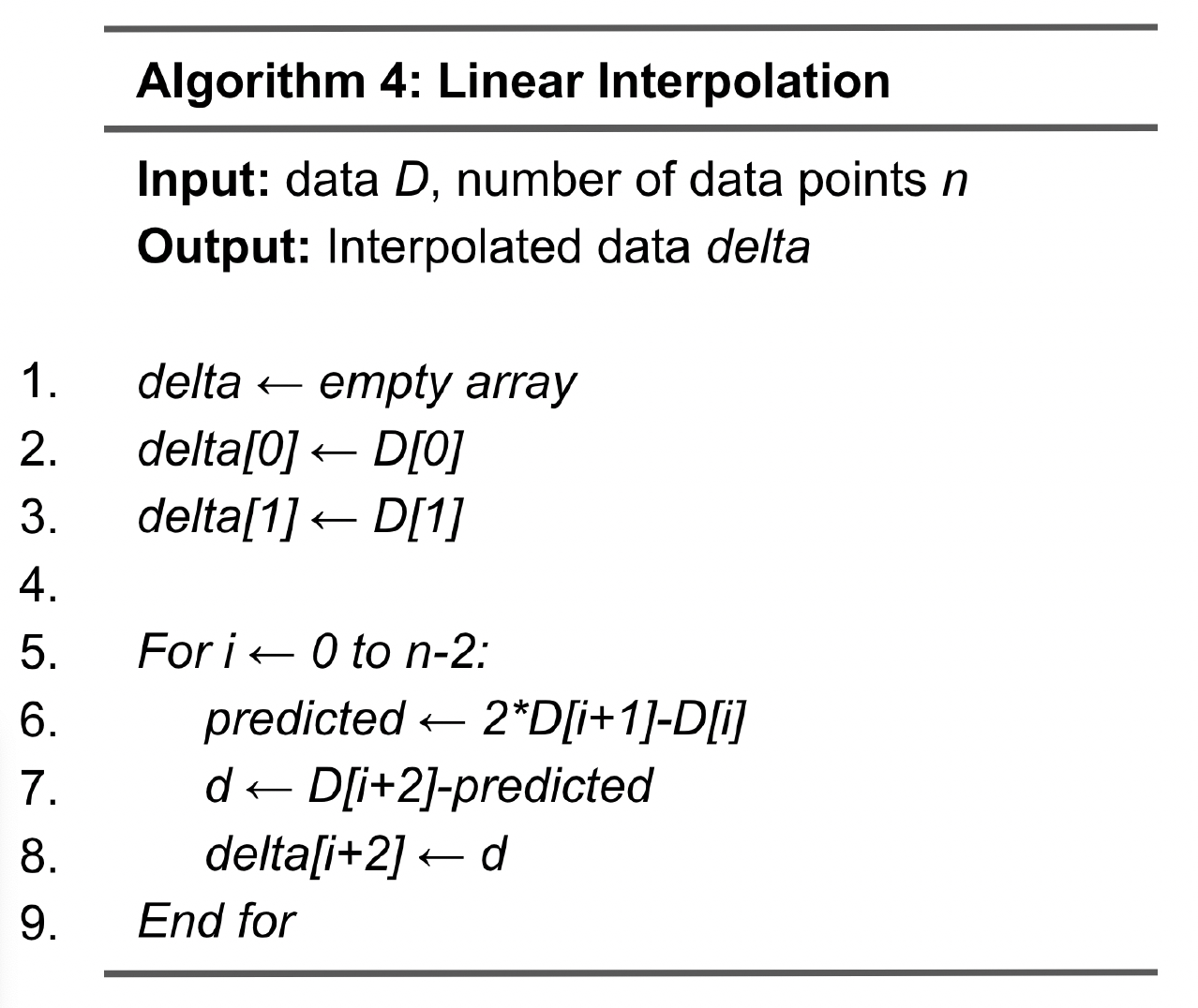 Algorithm 4 shows the steps to implement linear interpolation. From lines 1 to 3, variable delta is allocated memory space with delta[0] and delta[1] initialized to D[0] and D[1], respectively. Then, from lines 5 to 9, the algorithm loops through the rest of the data points and performs linear interpolation. At line 6, the predicted value (variable predicted) for data point i+2 is calculated by linearly extrapolating the values of D[i] and D[i+1]. We then compute the delta by subtracting the predicted value from the original value D[i+2] (Lines 7 and 8). The output of linear interpolation will be further quantized and compressed.