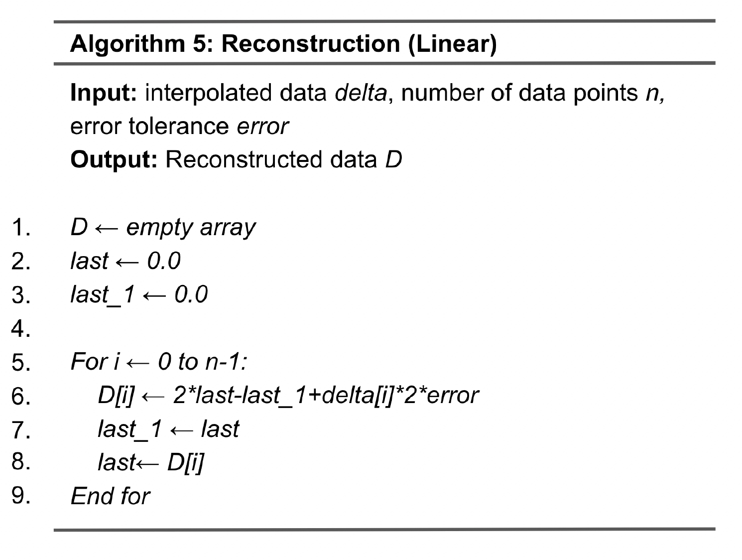 The data reconstruction for linear interpolation, as shown in Algorithm 5, is the inverse process of compression. The input to reconstruction is quantized data. Lines 5 to 9 loop through all data points where the variables last and last_1 capture the values of the two previous quantized data points, respectively. Line 6 calculates the predicted value by computing 2*last-last_1, and this will be added by the delta, which is delta[i]*2*error. Lines 7 and 8 update last_1 and last for calculating the next data point.