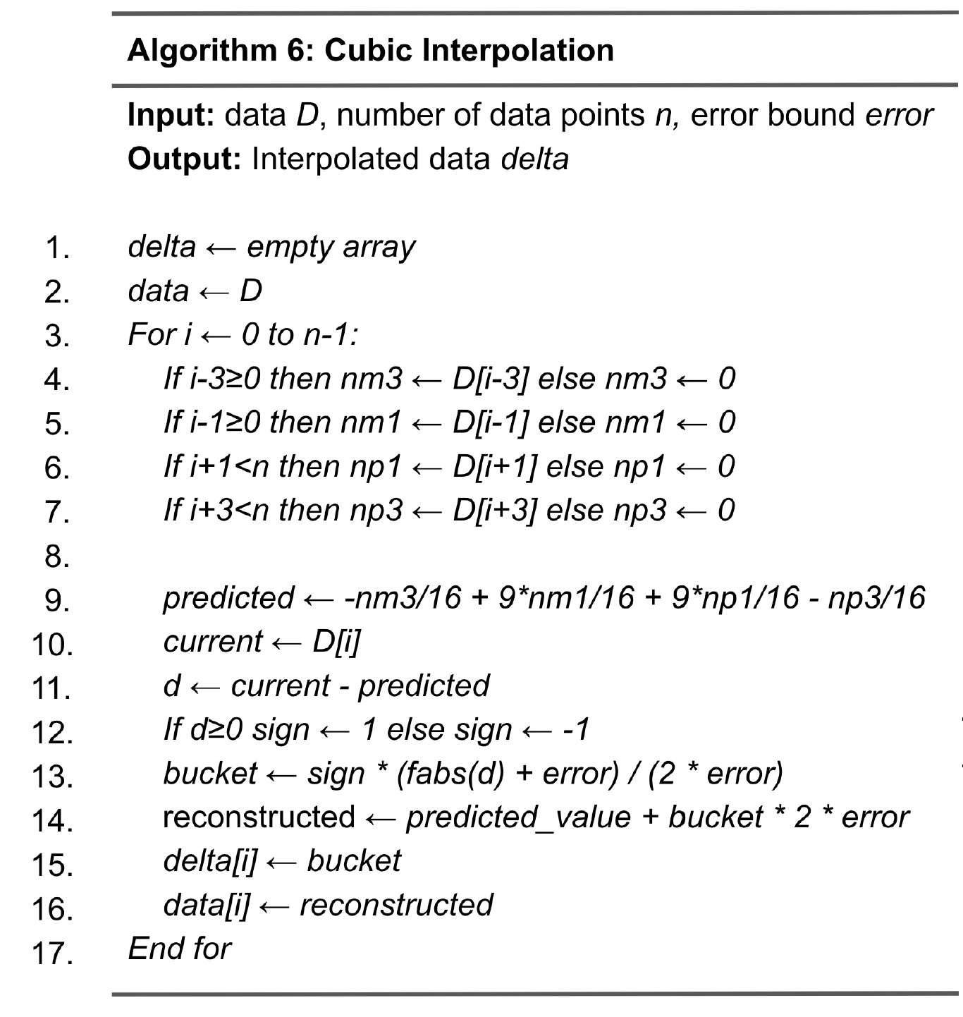 Algorithm 6 shows the steps of cubic interpolation. As compared to linear interpolation, which involves two adjacent data points, cubic interpolation uses four neighboring data points for a better quality of prediction. In particular, for data point D[i], it utilizes the values of D[i-3], D[i-1], D[i+1], and D[i+3], captured by variables nm3, nm1, np1, np3, respectively. The predicted value of D[i] is calculated in Line 9 as -nm3/16+9*nm1/16+9*np1/16-np3/16, and the delta d is calculated in line 11. Next, in lines 12 to 13, the delta is mapped to a bucket. Overall, the quantization is designed as follows: the range of bucket 0 is [-error, error] and the range of bucket 1 is [error, 3*error], and so on. Therefore, given delta d, the bucket assigned is sign*(fabs(d)+error)/(2*error), where fabs(d) is the absolute value of d and variable sign is the sign of d. Algorithm 7 shows the steps of reconstruction for cubic interpolation. As compared to the reconstruction for linear interpolation (Algorithm 5), the main difference is the calculation of the predicted value in line 9, which involves nm3, nm1, np1, and np3.