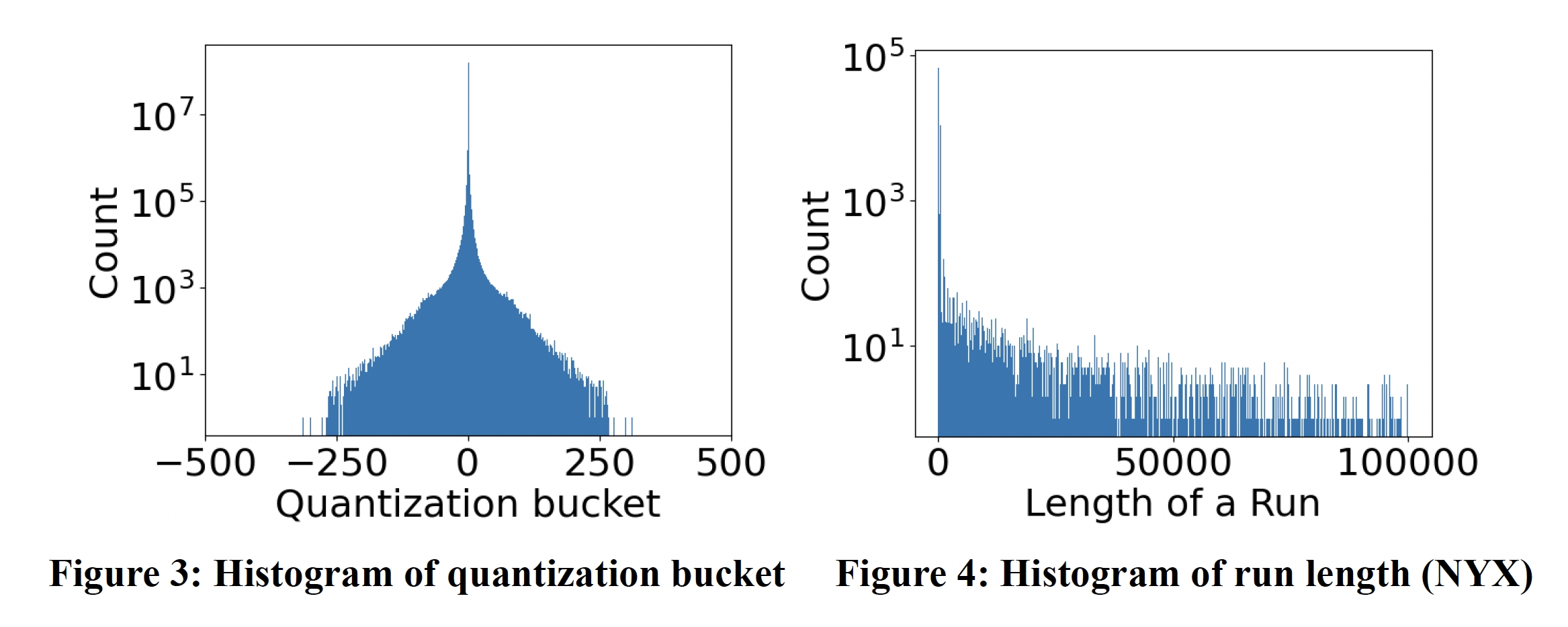 Figure 3 shows the histogram of quantization levels for NYX for cubic, where the X-axis is the bucket number and the Y-axis is the times a bucket is used to encode a data point. It is clear that the histogram follows a Gaussian distribution, which indicates that after cubic interpolation, the delta tends to center around zero, and the smaller the delta is, the higher the count is. Figure 4 further shows the histogram of run length for the NYX data. Clearly, the compression results in many long runs and leads to high compression ratios.