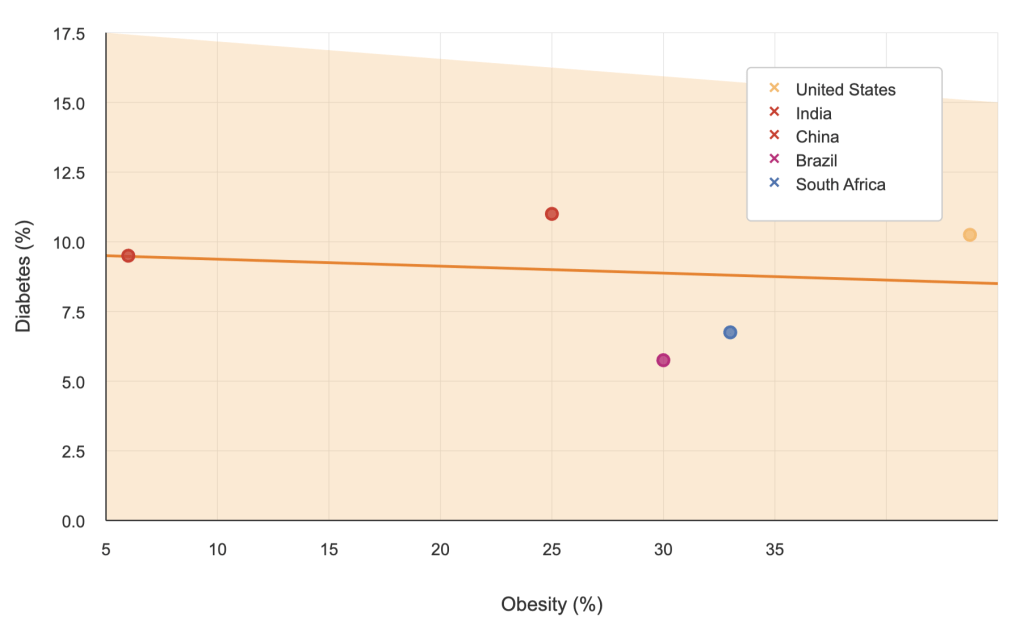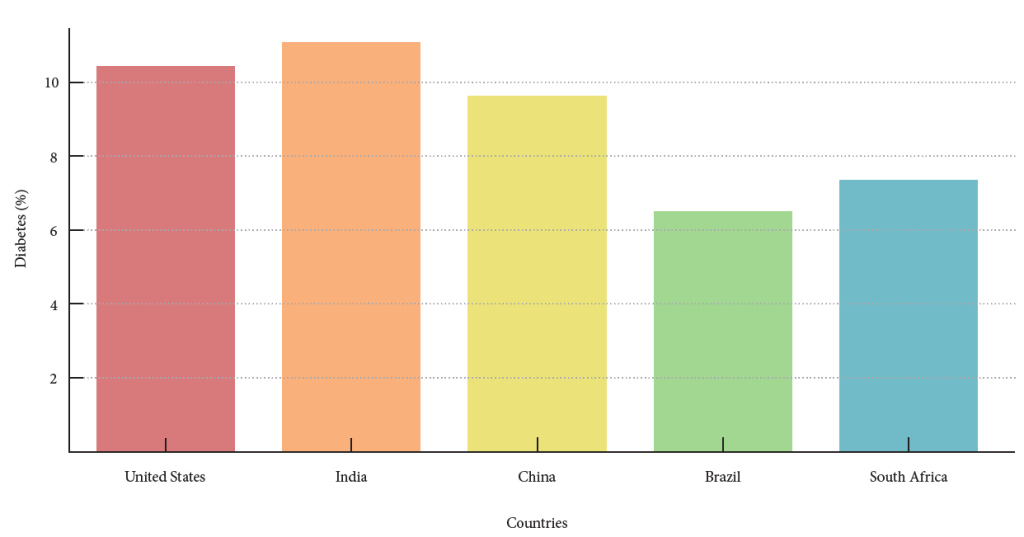 This cross-sectional observational study investigates diabetes prevalence and its comorbidities—obesity and hypertension—across five countries: the United States, India, China, Brazil, and South Africa. These countries were selected for their diverse economic development levels, healthcare systems, and cultural contexts, providing a robust basis for comparative analysis.