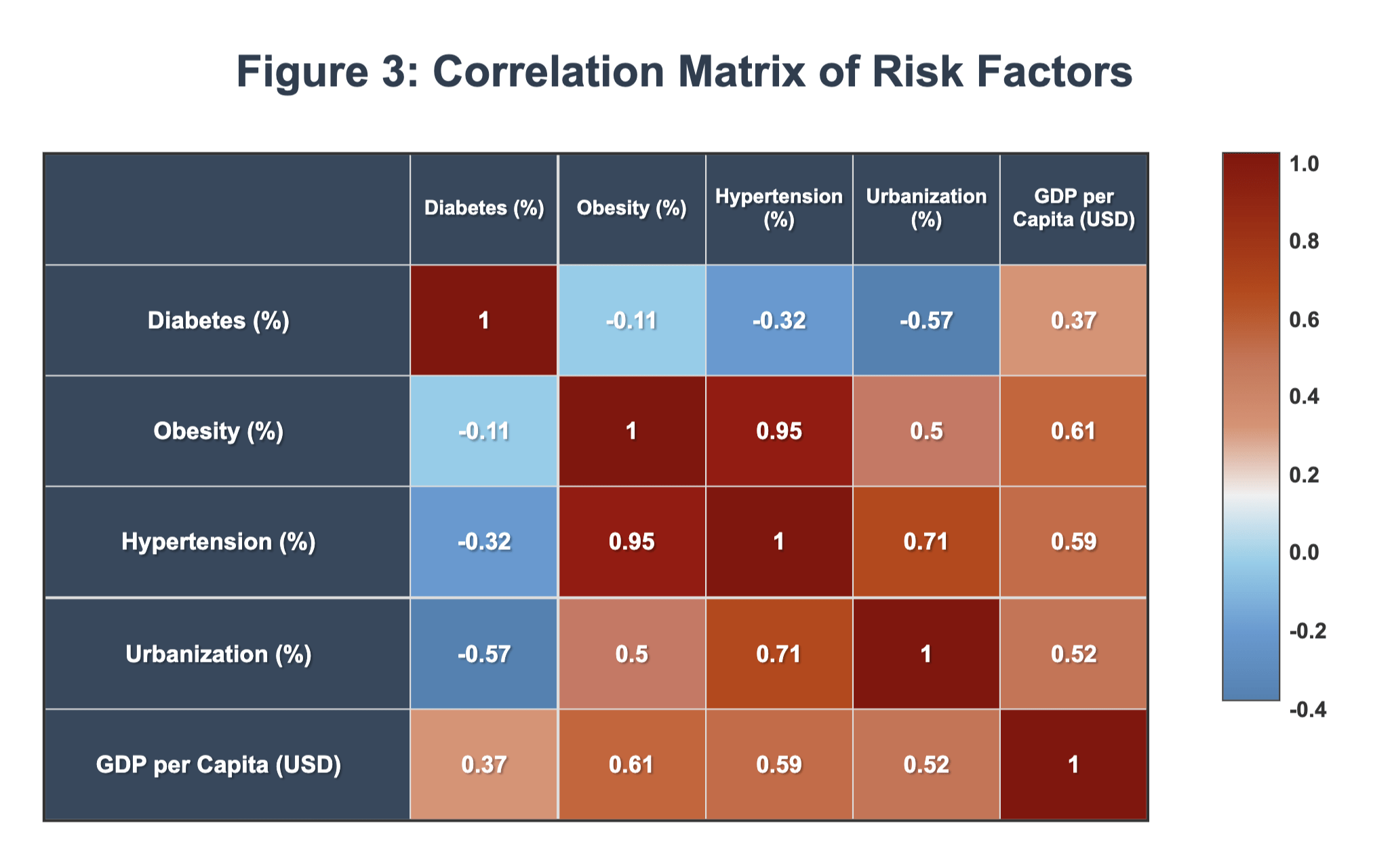 Multivariate linear regression modeled diabetes prevalence as a function of obesity, hypertension, urbanization rate, GDP per capita, and healthcare expenditure (% of GDP). The model was: