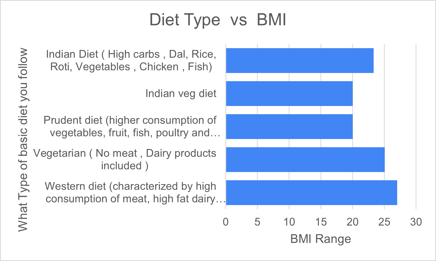 The survey results revealed health patterns among South Asians which can be associated with Diabetes and Pre Diabetes. Of the 50% of respondents, 42% exhibited elevated cholesterol levels, with males having a higher prevalence than females. In contrast, when looking at HDL levels, 96% of women have greater than 40 HDL, and 88% of men have greater than 40 HDL, and any level 40 or above is desirable. Of all respondents, 23% have greater than 60 HDL, which is optimal for the prevention of heart disease. This indicates that South Asians in America live relatively healthy lifestyles. Healthy lifestyle in this context mean they follow a healthier diet , exercise regularly and promote mental, physical and social well-being. Respondents were asking about consumption of food habits like consumption of nuts, diet followed, consumption of Soda, fasting habbits, to determine if they follow a healthier lifestyle. BMI results indicated that while the majority (48%) were of healthy weight, defined with a BMI between 18.5 to 24.9, many were overweight (about 20%), particularly those who follow the Indian or Western Diets (Chart -1). Many respondents also had a family history of diabetes (50%) and Hypertension (54%). (Chart-2) While the majority have a healthy fasting glucose range from 90-100 mg/dL, (Chart-3) a lot of respondents were in the 5.7-6.4% range of Hba1c, which suggests a pre-diabetes . Other levels such as LDL, HDL, and Hemoglobin were relatively normal among respondents.