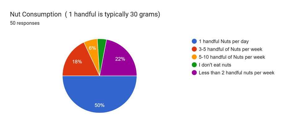 Lifestyle factors varied among respondents – while 48% got a healthy amount of exercise per week (1-2 hours or more), many were below the threshold (30%). Many respondents practice intermittent fasting a few times a year (16%) (Chart-4), but the results of the fasting remain unseen, most likely due to poor dietary choices. Nut intake was consistent among respondents, with 50% consuming about 30 grams of nuts per day, with almonds (85.7%), Cashews (77.1%), and Peanuts (70.8%) being the most popular.(Chart-5) Fruit intake was constant as well, with 78% of respondents consuming fruit regularly, eating about 1-2 cups of fruits daily (58.1%), and the most popular fruits being Apple (71.1%), Banana (77.1%), and Berries (65,3%). Regarding drinking consumption, 71% drank coffee, and 51.1% drank 1-2 cups of black coffee daily. 62% drink tea, and 43.8% of those who drink tea drink 1-2 cups of Chai (with sugar and milk). The majority of respondents drink alcohol, with 34% drinking 1-2 drinks a week, 20% drinking 2-5 cups a week, and 2% drinking 5-10 drinks a week.