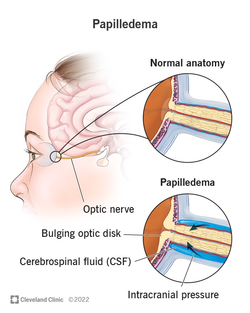 - Cleveland Clinic. Papilledema. Cleveland Clinic Health Library., 2022, https://my.clevelandclinic.org/health/diseases/17817-papilledema. [↩]