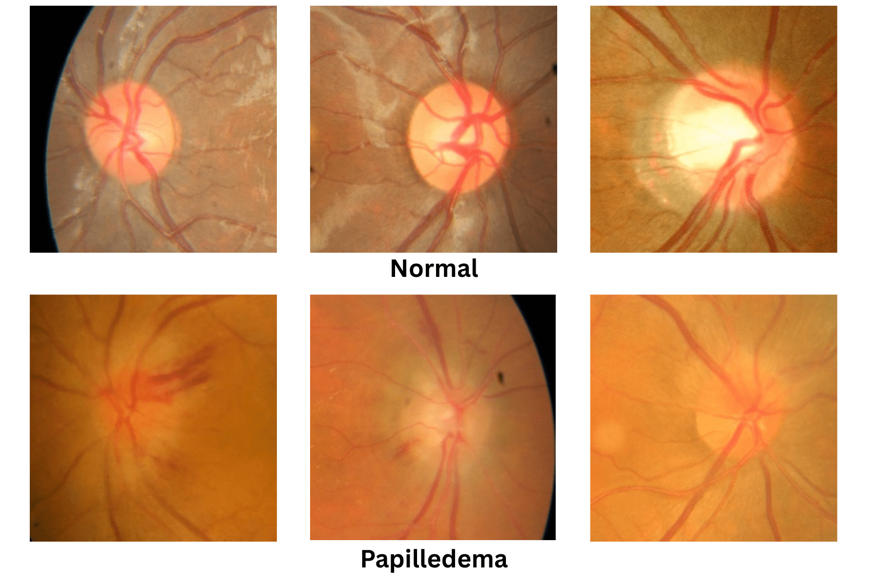 A machine learning model to detect Intracranial Hemorrhages was developed from a dataset of 1,369 colored PNG images, classified into 779 normal images, 295 papilledema images, and 295 pseudo papilledema images [Figure 2].10 However for the purpose of this research the pseudo papilledema images were disregarded. Pseudo papilledema is simply an abnormally elevated optic disk without accompanying the optic nerve edema commonly found in Papilledema. From this dataset, the papilledema images found with fundus photography, presents itself as retinal nerve swelling and blurred optic disk. This exclusion was intended to establish a baseline model performance for true pathology detection. A future extension of this work will include both papilledema and pseudo-papilledema to evaluate clinical differentiation in a three-class classification task. Demographic information such as age, sex, and ethnicity was not available in the dataset documentation. The absence of these attributes limits the ability to evaluate model generalizability across diverse populations, and this limitation is explicitly acknowledged in the discussion.