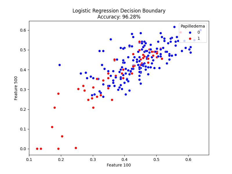 Logistic Regression achieved the highest classification accuracy among all the tested models, with an accuracy of 96.28% [Figure 3]. Even using a simple linear separation between classes, the model clearly distinguished optic disc swelling patterns characteristic of papilledema, demonstrating that simple linear relationships capture meaningful retinal structure differences. The model performed especially well on the normal class with a precision of 0.97 and recall of 0.98. For the papilledema class, its precision reached 0.94 and a recall of 0.91, resulting in an overall macro-averaged F1-score of 0.95 [Figure 7].
