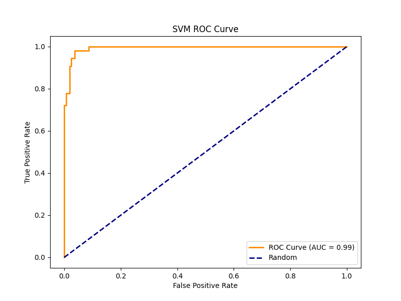 The Random Forest feature-importance map [Figure 4] showed that the most predictive pixels were found near the optic disc, the exact region affected first by papilledema when intracranial pressure rises. This confirms that the model used meaningful image regions rather than random pixel noise. The high AUC values in the ROC curves for both Random Forest [Figure 5] and SVM [Figure 6] meaning that the models could correctly identify most papilledema cases while lowering false positives. The Logistic Regression plots and classification summary table also support this, high recall ensures that few true papilledema cases are missed. These insights are key in medical applications, especially with artificial intelligence where explainability is crucial in validating and believing in results.