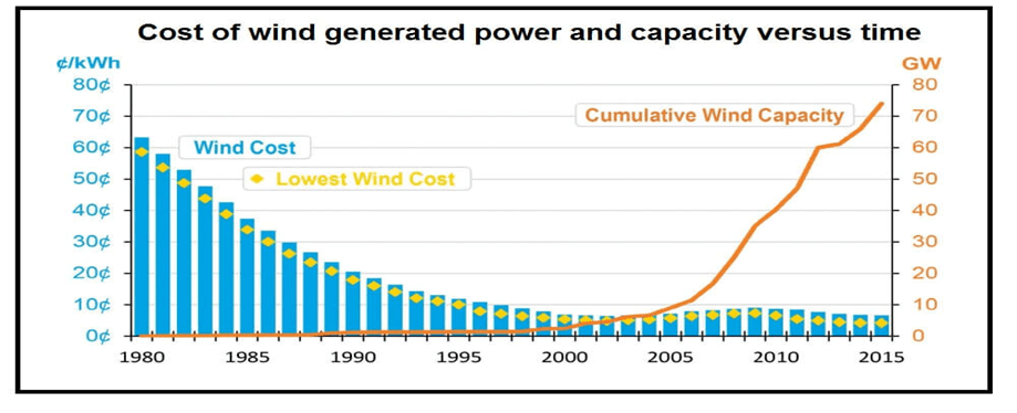Wind turbines are evolving in efficiency because of larger rotor diameters, taller towers, and better materials leading to increased energy output and reduced costs per unit. Manufacturing and installation economies of scale have lowered capital costs.