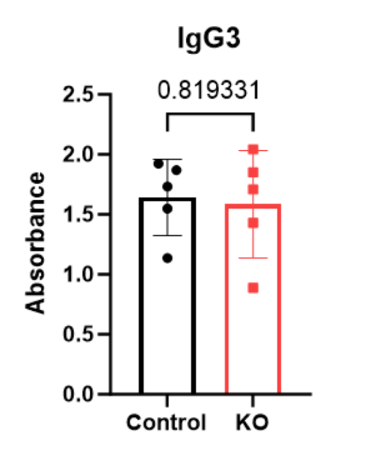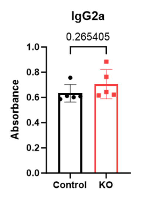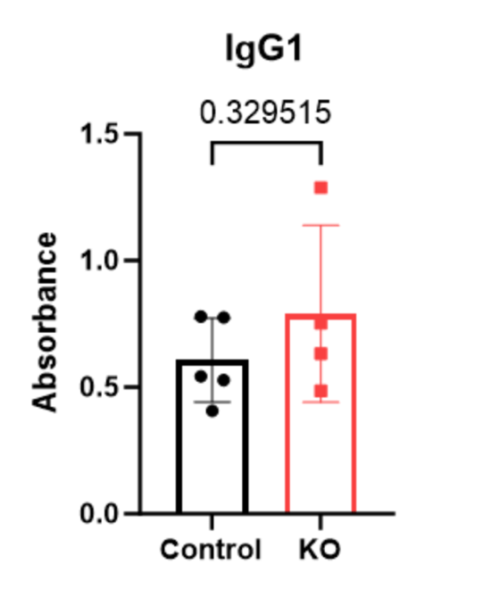 This research was subject to limitations due to the available sample size that should be considered when interpreting the results. The experimental groups (n=5 for each condition) are too small to draw strong statistical conclusions, especially given the biological variability in immune systems. Although one significant p-value was obtained for total IgG (p = 0.0458), the result is very close to the 0.05 threshold, which, given the small sample size, could be due to random variability. The small sample size arose from the restricted availability of genetically modified PTPN2 KO and WT control mice at the time of experimentation.