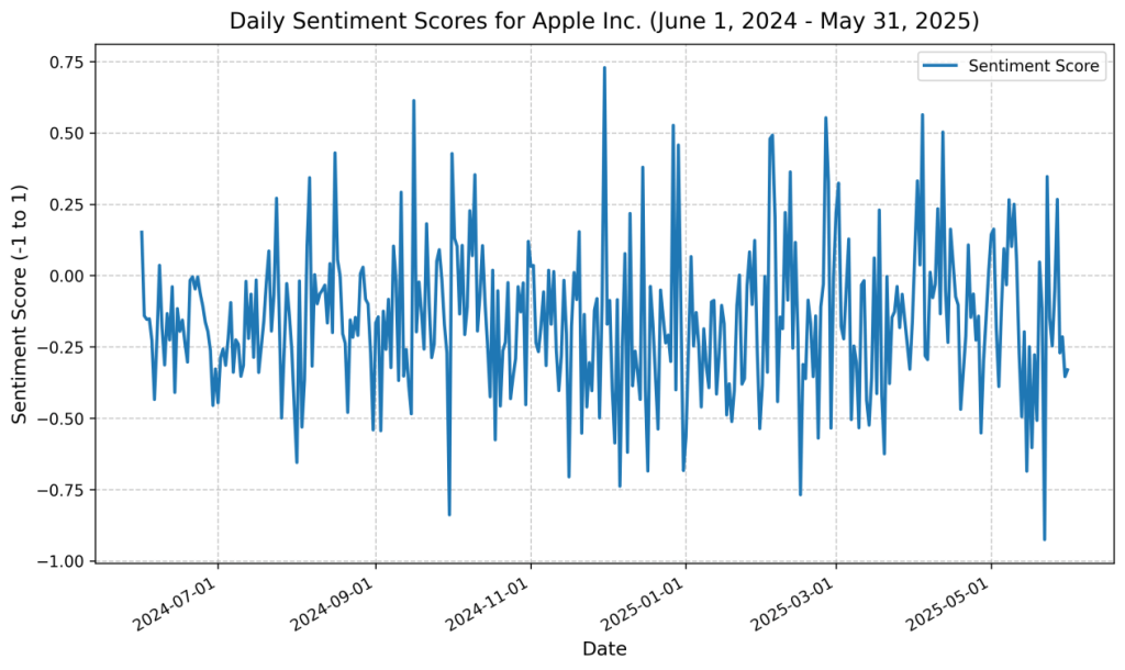), confirming that negative sentiment has a more pronounced impact on market fluctuations. This supports the hypothesis that negative news events, such as regulatory pressures or earnings misses, drive larger price movements than positive events. However, the short-term volatility of sentiment scores indicates their sensitivity to the frequency of news coverage and specific events, necessitating further validation of their predictive efficacy in conjunction with financial data.