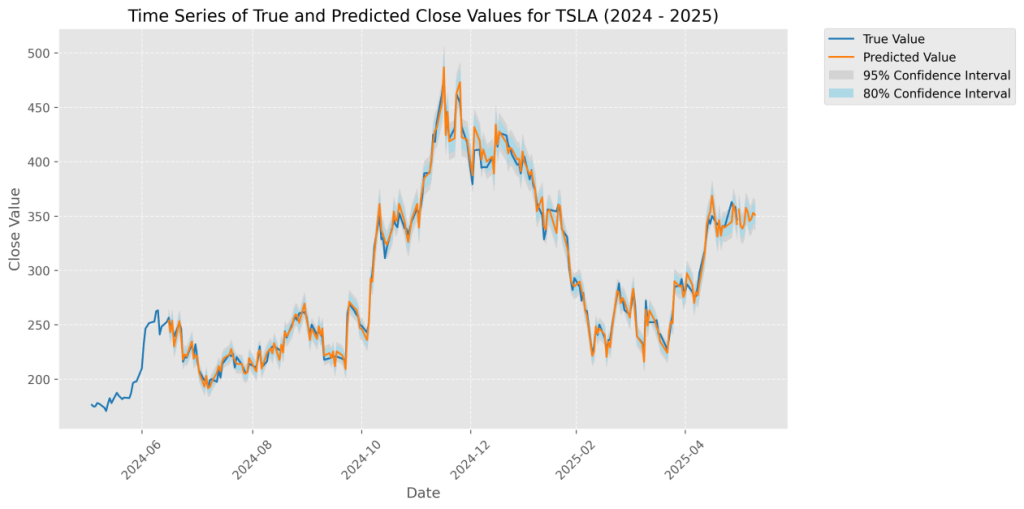 For instance, Tesla, with high media attention and volatility, showed the largest improvement, whereas Meta, with relatively stable sentiment, showed smaller gains.The figure below illustrates a comparison between the actual closing prices of META and Tesla from June 2024 to June 2025 and the predicted values generated by the sentiment-enhanced P-sLSTM model. The blue curve represents the actual values, while the orange curve represents the model’s predicted values. The blue shaded area indicates the