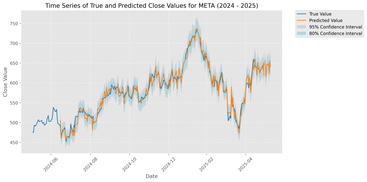 For instance, Tesla, with high media attention and volatility, showed the largest improvement, whereas Meta, with relatively stable sentiment, showed smaller gains.The figure below illustrates a comparison between the actual closing prices of META and Tesla from June 2024 to June 2025 and the predicted values generated by the sentiment-enhanced P-sLSTM model. The blue curve represents the actual values, while the orange curve represents the model’s predicted values. The blue shaded area indicates the