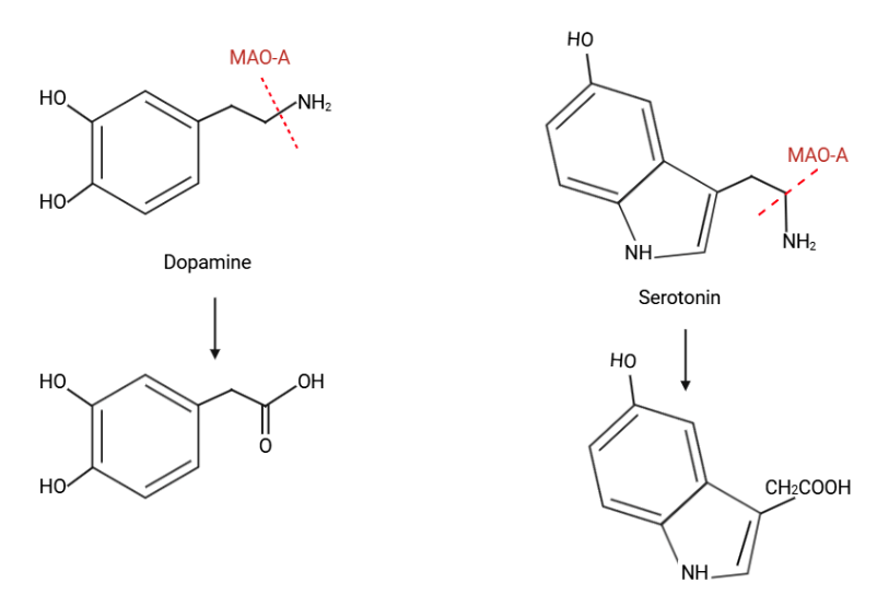 The MAO-A is the key enzyme for the degradation of serotonin and catecholamines which has been associated with a higher risk for antisocial behavior (ASB) and violence, particularly in males with a history of child maltreatment40. Chemical degradation of these organic compounds can be found in Figure 10.