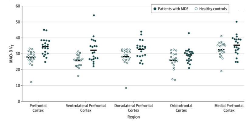 Monoamine‑oxidase activity in the brain correlates with the length of major depressive episodes. Moriguchi et al. conducted a case‑control study from April 2014 to August 2018 to explore brain chemistry differences in people with major depressive episodes (MDEs) compared to healthy controls. The study involved 20 patients with unmedicated MDEs from Toronto in a specialized psychiatric hospital and 20 healthy age‑matched controls. Participants were rigorously screened to rule out other psychiatric or neurological disorders, and all refrained from alcohol, grapefruit juice, and caffeine on the day of the scan. Using advanced imaging techniques, including a high‑resolution 3‑dimensional PET scanner combined with MRI, the researchers measured the total distribution volume (VT) of monoamine oxidase B (MAO‑B), an enzyme that helps break down brain chemicals and plays a key role in mood regulation S. Moriguchi et al., 2019. They found that patients with MDEs had, on average, a 26% higher MAO‑B VT in the prefrontal cortex compared to healthy controls (Figure 14)—a robust difference that persisted even after excluding an outlier value S. Moriguchi et al., 2019. Moreover, this elevated enzyme activity was not uniform across the brain; it was especially pronounced in regions such as the ventrolateral, dorsolateral, and orbitofrontal prefrontal cortices, the thalamus, and the inferior parietal cortex S. Moriguchi et al., 2019. Importantly, among the depressed patients, a longer duration of illness was strongly linked to even higher MAO‑B levels, suggesting that chronic depression may be associated with progressive changes in brain chemistry S. Moriguchi et al., 2019. Graph of results are shown in figure 14.