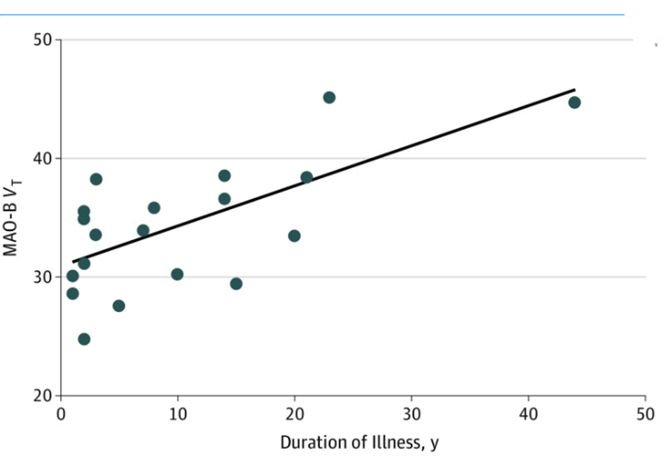In individuals with MDEs, a longer illness duration correlated with higher MAO-B VT across multiple brain regions. A repeated-measures ANCOVA revealed a significant overall association between illness duration and MAO-B VT (F(1,18) = 18.1, P < .001), along with a notable interaction between duration and specific brain regions (F(7,12) = 9.1, P = .02). Increased MAO-B VT was particularly evident in the ventrolateral and dorsolateral prefrontal cortices, orbitofrontal cortex, anterior cingulate cortex (ACC), thalamus, inferior parietal cortex, temporal cortex, and occipital cortex, suggesting a widespread impact of prolonged depression on brain chemistry. There is a correlation between MAO-B VT and Duration of Illness with r = 0.65 (Figure 16).